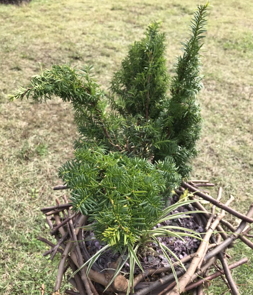 小動物はポットのコニファーを2種類合わせて、盆栽の針金巻きにて形を作り剪定。 目はセンニチコウの花。