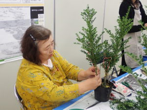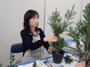 続いて小林江見理事が、鉢植えのキンメツゲを鳥のトピアリーに仕立てる実技の講習を行いました。